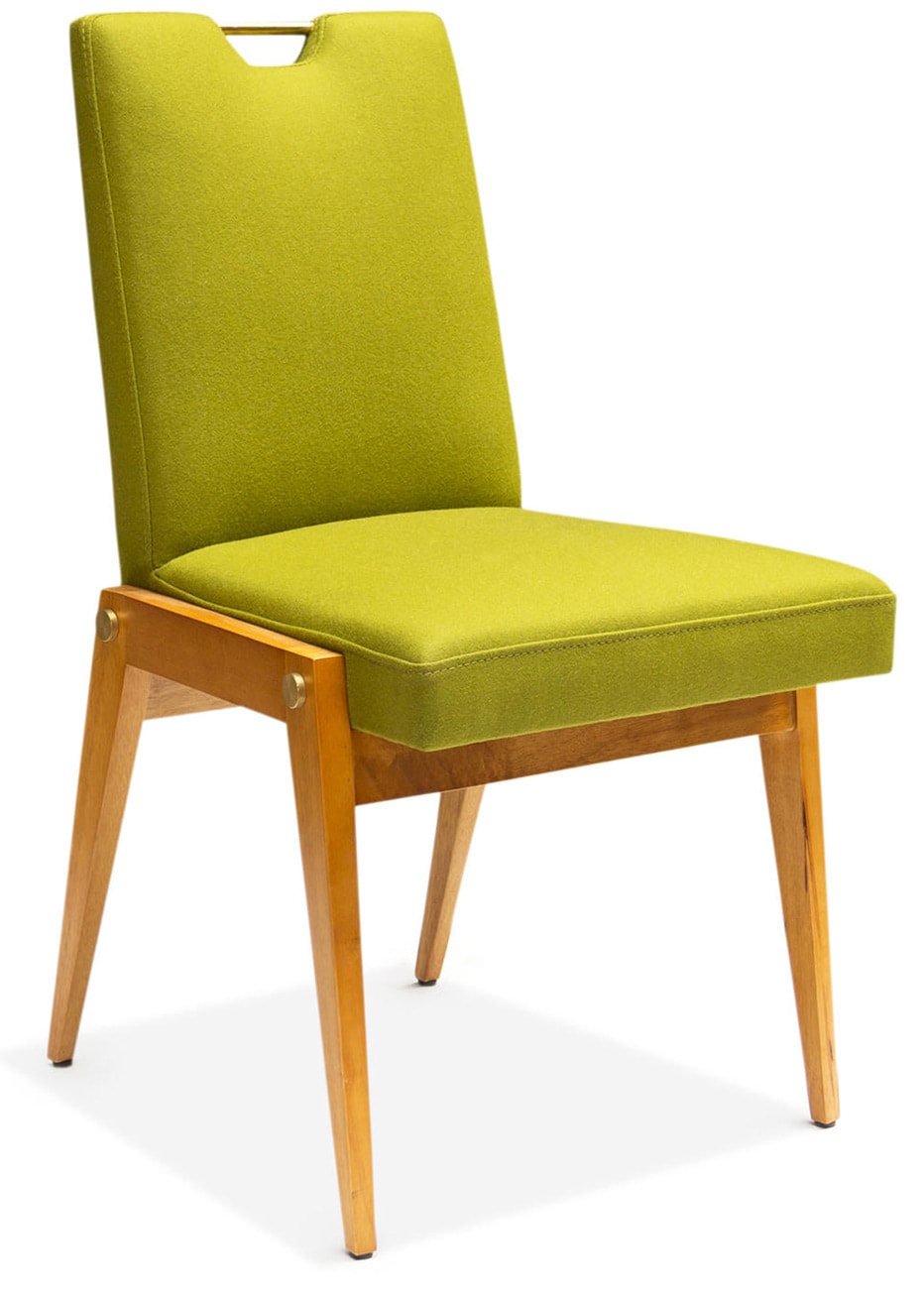 ADD TO CARTStreamlined legs made from honeyed wood cradle an upholstered seat and back in our Modernist Amsterdam Dining Chair. Swanky details—oversized brass bolts and a surprising and functional brass back handle—dress up the Mid-Century vibe.
