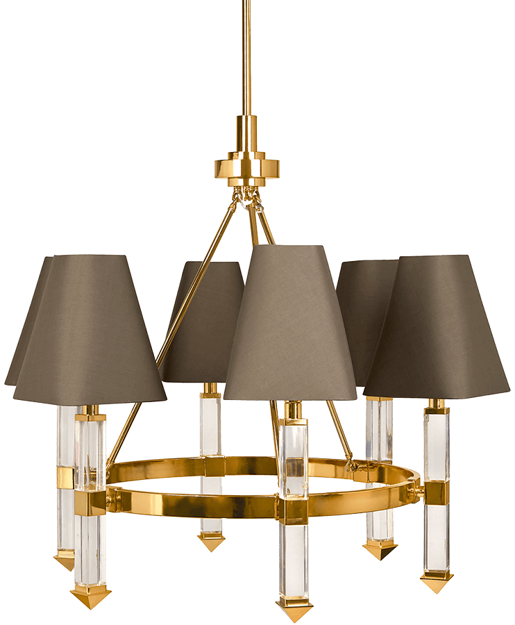 ADD TO CARTTraditional elegance meets modern glamour in our Jacques Six-Arm Chandelier. A custom-tooled brass ring supports six thick Lucite stems with swanky grey silk shades. Modernize a traditional dining room or amplify a formal entryway.